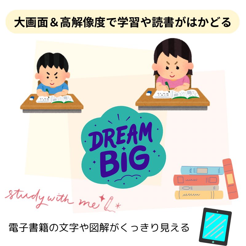 大画面で読みやすく、長時間の学習に向いている。リビング据え置き用に最適。