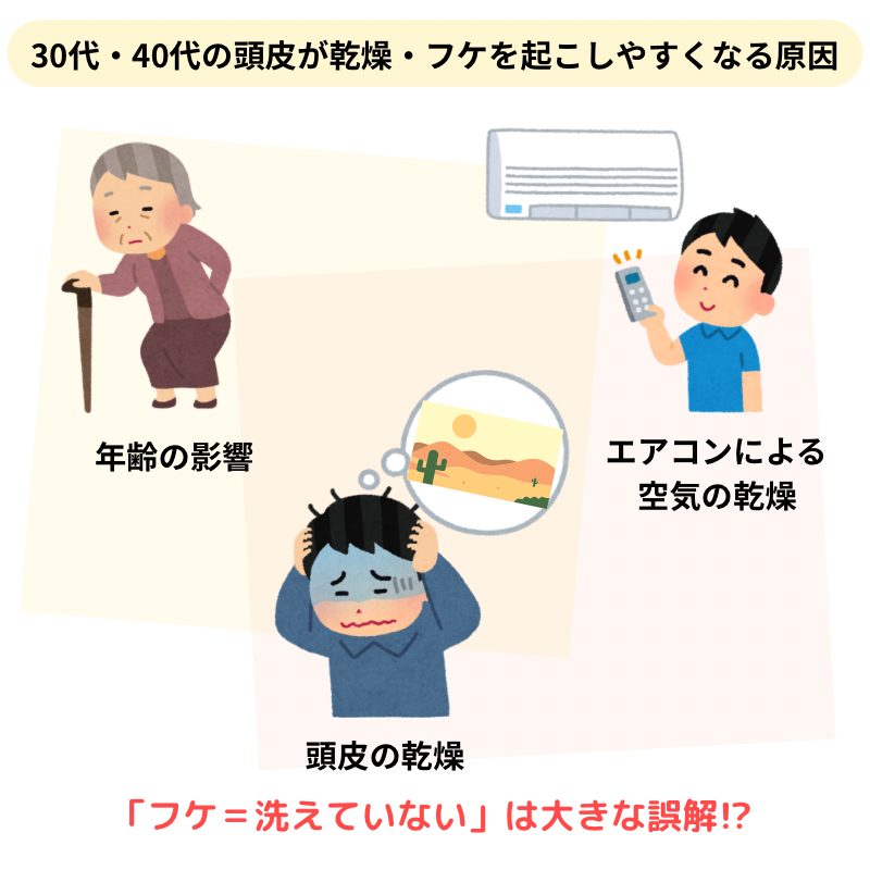 主な原因は、頭皮の皮脂や水分が不足していること。特に30代・40代になると皮脂量が減りやすいうえに、エアコン環境や洗いすぎが重なることで、頭皮のうるおいを守るバリア機能が低下し、このタイプのフケが出やすくなります。