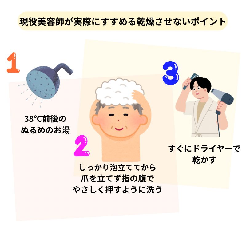 このぬるめのお湯・泡で洗う・すぐ乾かすの3つを意識するだけでも、頭皮の乾燥トラブルは大きく減らせます。